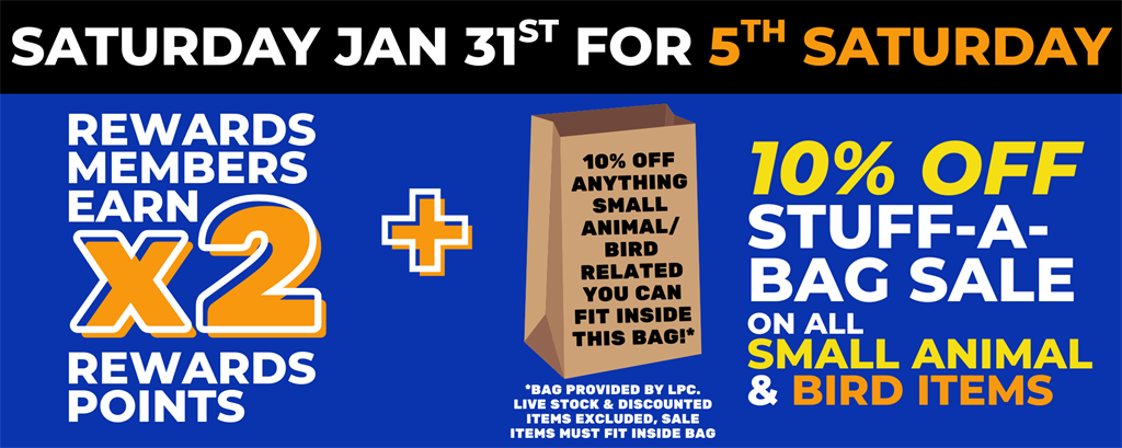 We’re also making it extra exciting with a Stuff-A-Bag Sale on all Small Animal & Bird supplies (toys, treats, food, and more! Supplies only, no live animals). Fill your bag with your favorites and save big! Saturday Jan. 31st ONLY!
